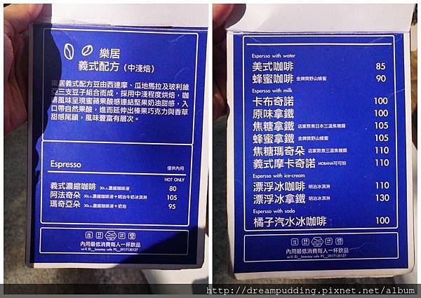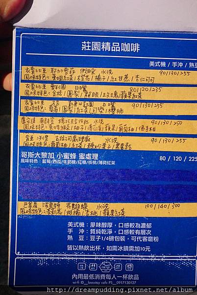 以咖啡為主,也有一些甜點,還有滷味,另外有盒裝蛋糕需兩天前預訂。價位我覺得很親民耶,咖啡都在100元上下,比台中市區便宜好多>。<