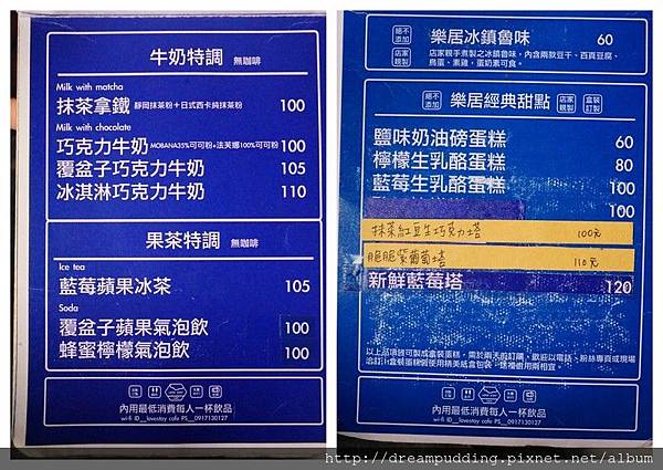 內用的低消為一杯飲品,甜點跟滷味都不列入計算,滷味?是的,你沒看錯,樂居咖啡的特色之一就是他賣滷味;可惜這天已經飽足,點了甜點跟咖啡之後,無法再裝一個滷味(殘念)