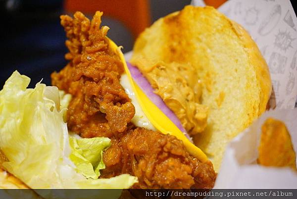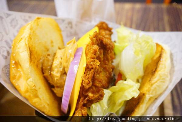 漢堡裡也是滿滿的料,有紫洋蔥、起司、生菜、牛番茄、酸黃瓜跟特製漢堡醬,炸雞很大一塊,皮酥中帶點脆,雞肉嫩且保有肉汁,蠻喜歡它的花生醬,濃稠帶有顆粒感,我很喜歡;不過花生醬搭炸類吃到後面有點膩,我下次要搭配牛肉堡吃。