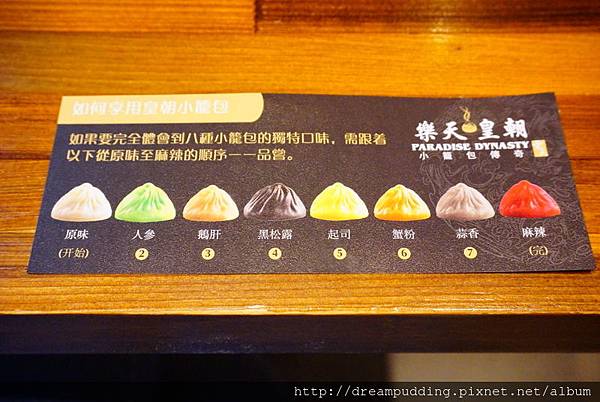 八色小籠包上桌會附上一張食用順序卡。