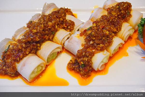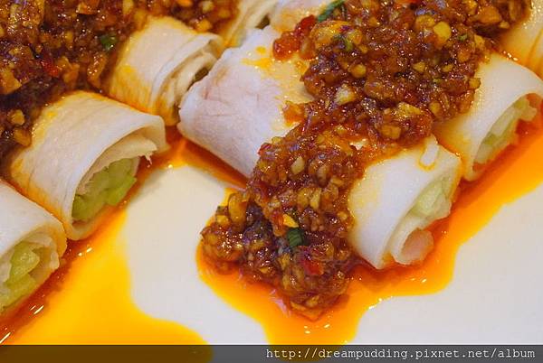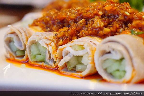上頭的蒜泥特地調味過,口感濃厚卻不鹹膩,豬肉裡捲著黃瓜,上面濃郁內部清爽,很有層次的一道涼菜。