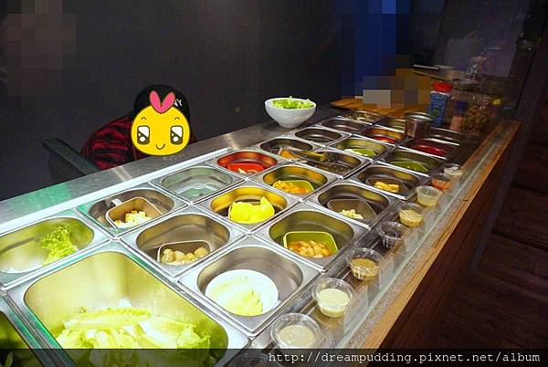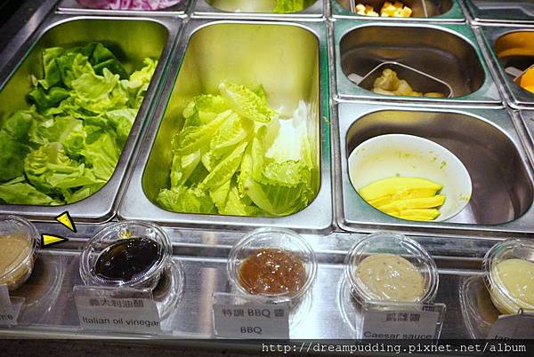 透明玻璃看得到所有食材,乾淨整潔,而所有的沙拉醬料也都有擺一小盅在料理檯前。