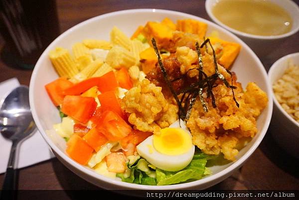 食材新鮮,生菜鮮嫩,雞肉外酥內軟,份量多且大塊,炸得絲毫無油膩感,這碗我忘記我搭配哪種沙拉醬料了,只記得是辣的@@