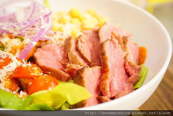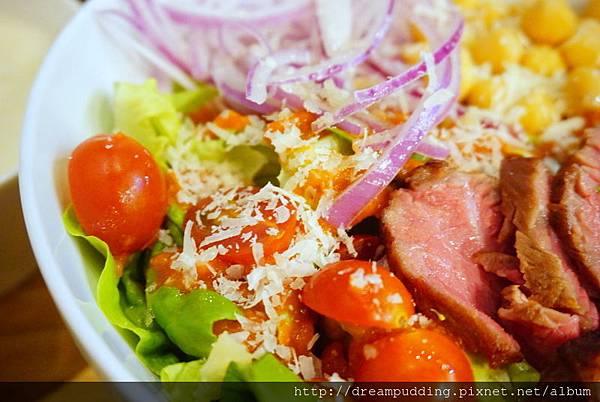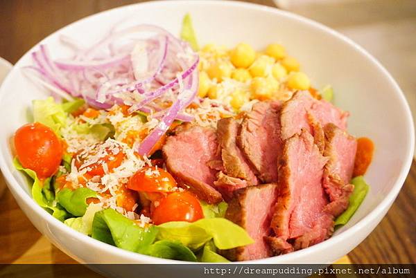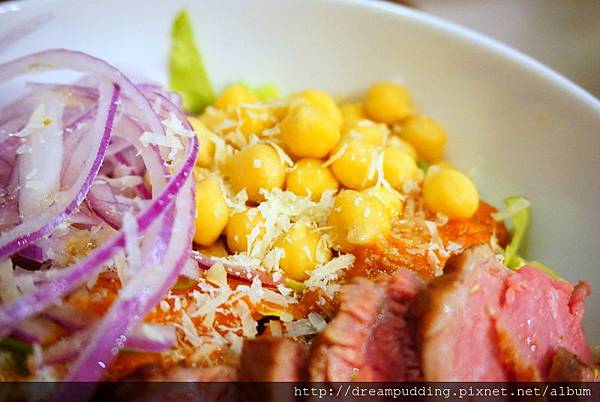 牛排沙拉內容物有生菜、牛排、洋蔥、鷹嘴豆、番茄、現刨起司。