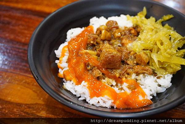 滷肉飯,醬香十足,米飯不會太軟,肥肉肥而不膩,搭配解膩的醬菜跟甜辣的辣椒醬,我可以自己吃完一碗>////<