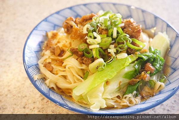 乾麵軟中帶Q,口感順溜,有著一股迷人的古早味,搭配著水煮白菜的些微清甜,這碗乾麵,好吃