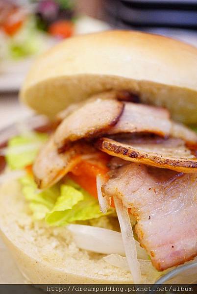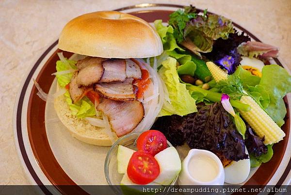 手工製作的小麥貝果抹上奶油香烤過後外酥內蓬鬆還帶點緊實,搭配牛番茄、生菜、洋蔥還有柴窯火腿製作所的煙燻培根,醬汁可選擇辣或不辣;口感豐富且培根肥瘦適中,吃起來也很不錯耶。