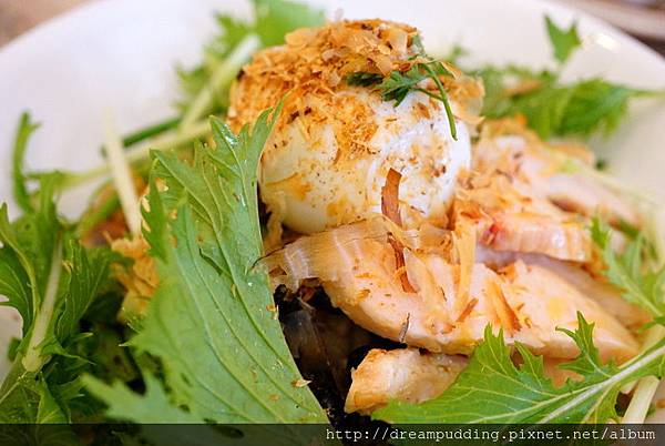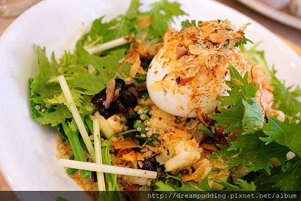 沙拉裡有大量的野菜,水煮調味過的龍鬚菜、藜麥、黑豆、一塊豆腐及嫩彈的雞胸肉,還有一整顆冰涼彈嫩的半熟糖心蛋;醬汁很多層次,一半是以橄欖油為基底的醬汁,另一半是濃郁的胡麻醬汁,再搭上新鮮柴魚片,整體豐富感十足且非常多層次,好吃!