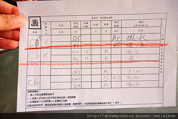 點菜單也是重複利用,很環保。而點菜就是照著欄位把自己想吃的餐點編號填進去,很佛心的是加麵加飯都是免費的喔!是說他們家就算沒加麵加飯,份量也都很足耶;不收服務費,如果想給服務人員鼓勵,可以勾選鼓勵金20元那一欄。