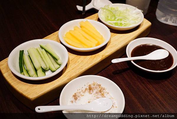 一開始會先上配菜盤,這天的配菜有清脆的小黃瓜絲、清甜的哈密瓜絲、蔥絲及甜麵醬還有白糖混跳跳糖盤。