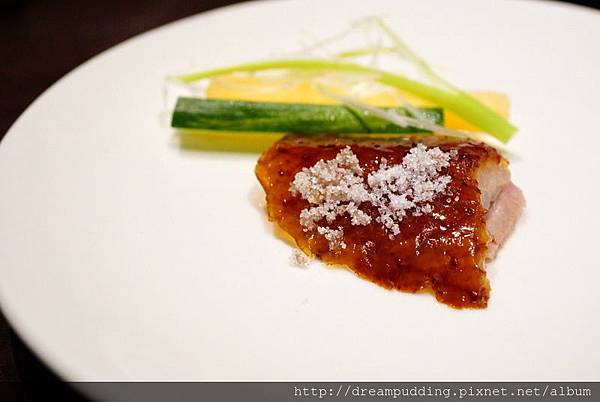 第一盤會先片下鴨胸部位的鴨皮,口感上比較肥潤,幾乎是入口沒幾下就化,因此要盡快品嘗。