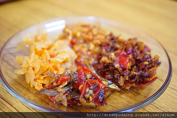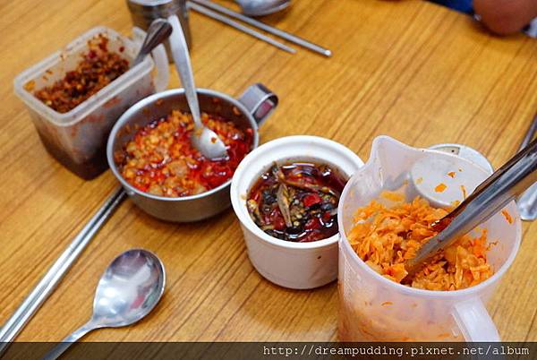 在店內用餐可以享用桌上的佐料,這天來總共看到四種。有辣菜圃、招牌的小魚乾辣椒醬(這個店內是有販售的)還有醃漬的高麗菜乾。