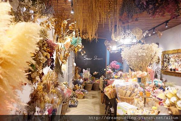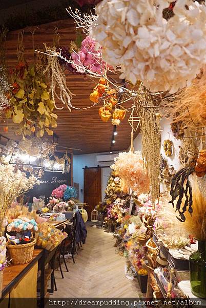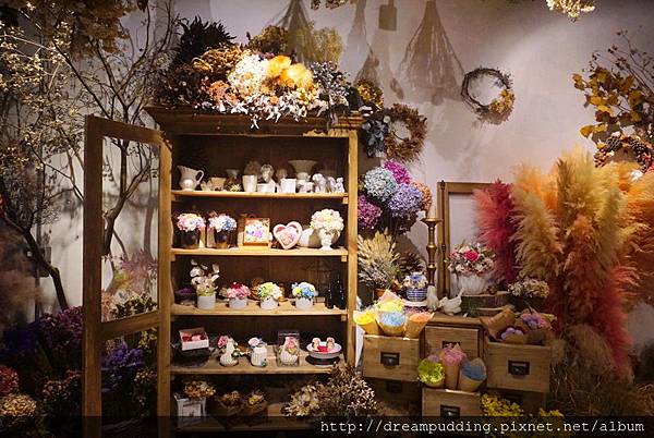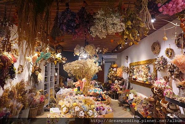 屋內有滿滿的乾燥花作品,很夢幻的一個地方啊。看著滿室的花,心情不知為什麼都繽紛了起來。