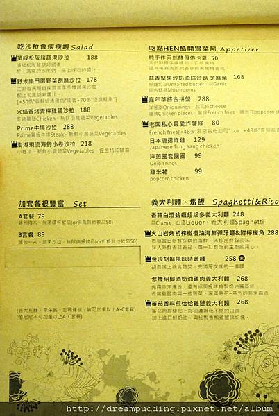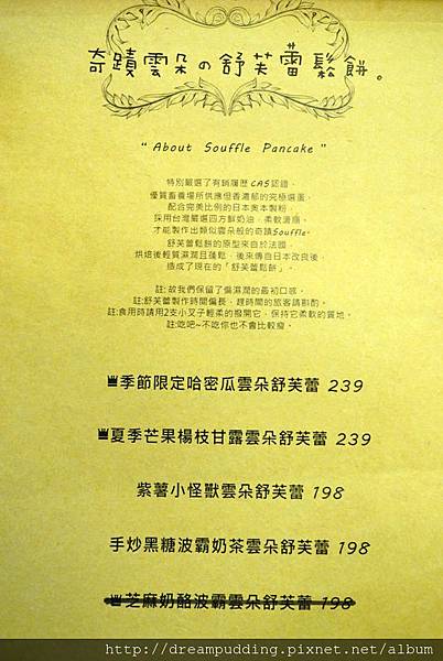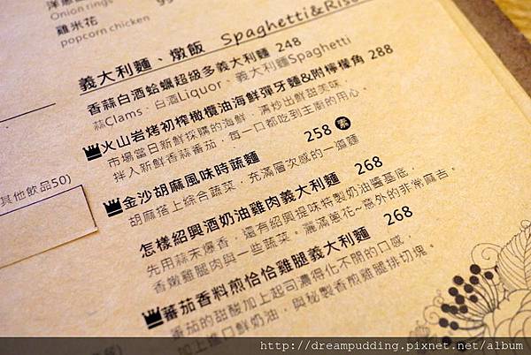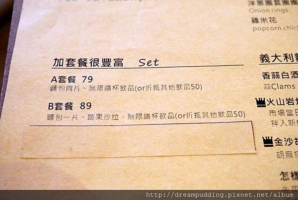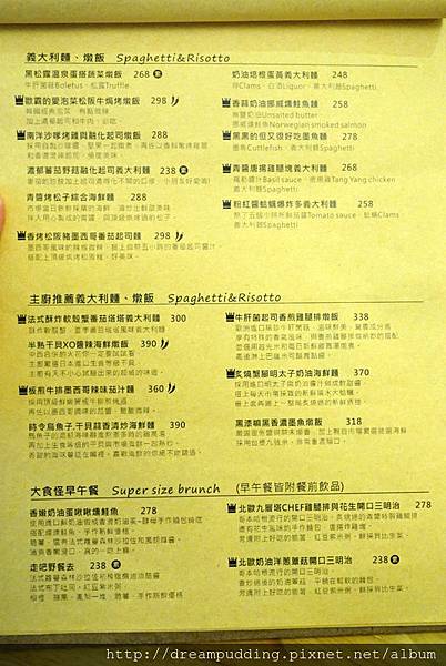 餐點除了有義大利麵跟燉飯之外還有一些輕食早午餐,以及FB粉絲頁上面強打的舒芙蕾鬆餅,可以單點也可以升級套餐,MENU上面的餐點介紹都很詳細,附上FB粉絲頁的菜單相簿連結,點選進去看大圖會更清楚。