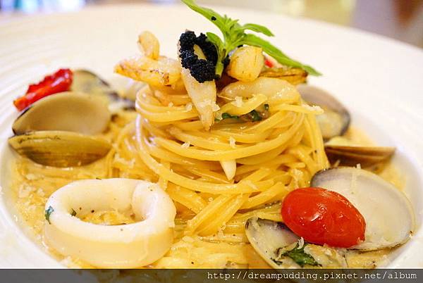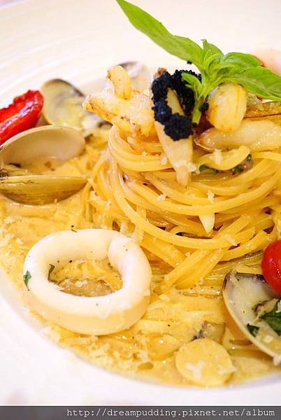 醬汁為進口明太子混合奶油而成,海鮮採用每天上市場採買的大蛤蠣再搭配炙燒過的帶有Q彈咬勁的透抽,除此之外還有蟹腿肉及魚子醬。