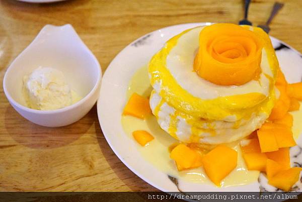 鬆餅採用日本進口奧本製粉跟育誠藻好蛋及光泉鮮乳不加一滴水下去製作,再搭配枋山愛王芒果及芒果卡士達香緹乳霜;現點現製作,所以等待時間會比較久一些些,上桌還會搭配一球香草冰淇淋。