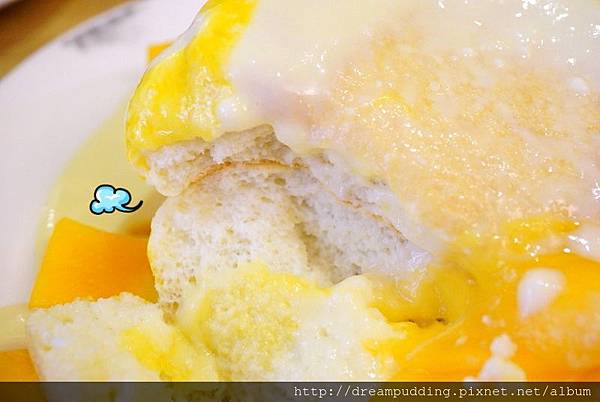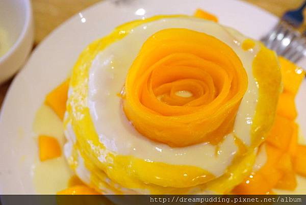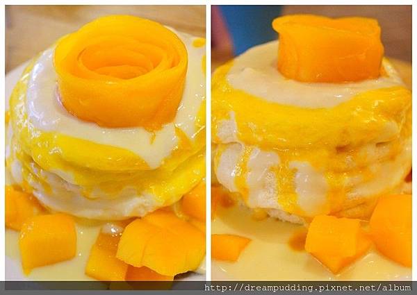 鬆餅口感是比較輕盈柔軟的那種,但是空氣輕盈感的話,我覺得屋莎比較強烈,野米樂的則是存在感比較明顯,真的比較偏舒芙蕾口感;整體來說口感不會太甜膩,淋醬也不膩口,就是潤澤的甜潤感,芒果很香甜。