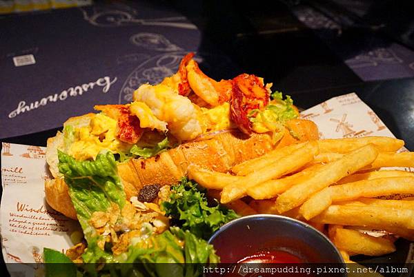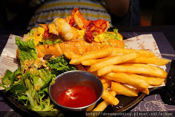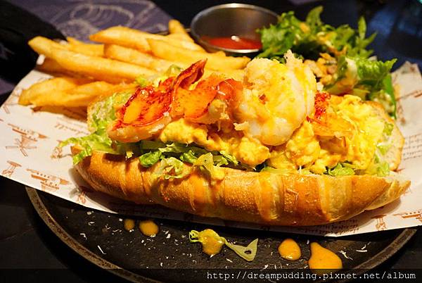 麵包採用潛艇堡,中間夾著波士頓龍蝦、龍蝦腦炒蛋,上頭還淋上海膽醬,一旁還附了有機生菜沙拉及炸薯片。