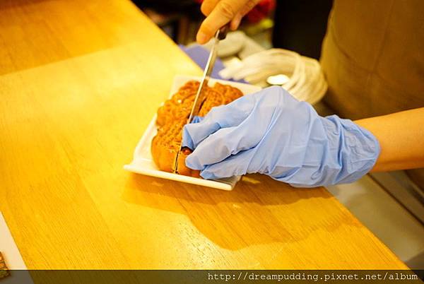 中式喜餅若是現場試吃,門市人員還會幫你切小塊,還貼心的戴上手套切取。