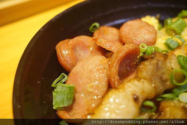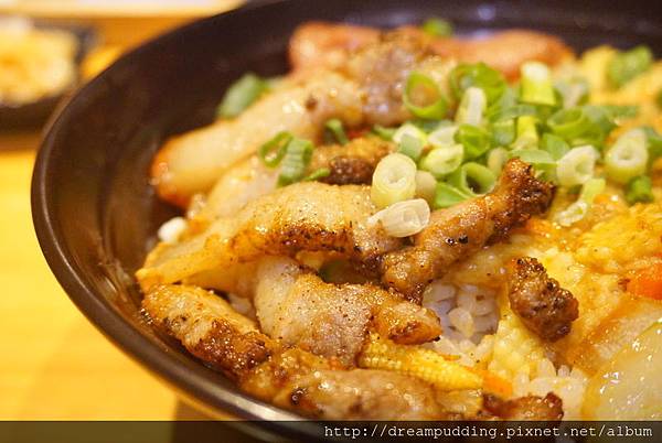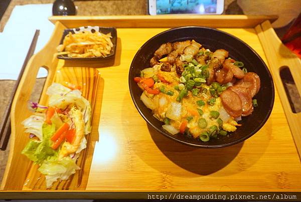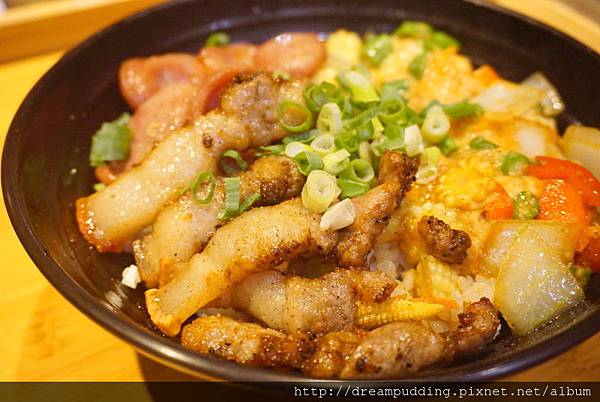 鹹豬尬土雞香腸蓋飯,NT 150元,加60元升級套餐。