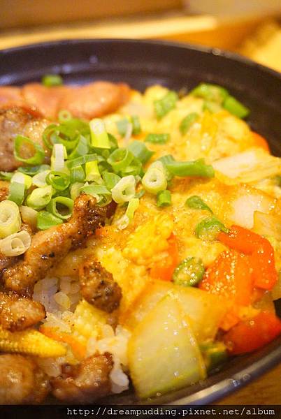飯的一另一邊鋪著滿滿的蔬菜,是由洋蔥、甜椒、玉米跟四季豆和蛋液一塊做成的滑蛋,滑嫩豐富,很好吃