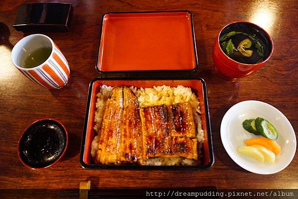 我們點了大份的鰻魚飯,為日幣3400元,還有附上鰹魚湯及一碟醬菜。