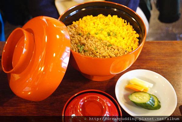 主食為碎蛋雞肉蓋飯,一樣附上鰹魚湯及一碟醬菜,還有一塊蜜汁烤雞肉;蓋飯單吃味道也足,雞肉烤得十分軟嫩,帶有炙烤的香氣,是好吃的雞肉。