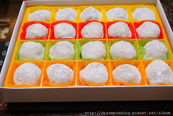 口味有鹹麻糬、素食、花生跟紅豆,可以選擇單一,也可以選擇綜合,每一顆都會個別在格子裡放好放滿。