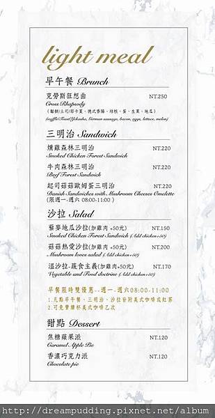 餐點有早午餐、主食跟甜點及下午茶,選擇種類很多。(MENU下載自克勞斯粉絲頁,也可以點選至克勞斯粉絲頁看更多完整清楚的菜單喔)