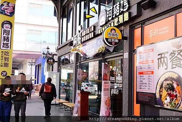 全台首家阿豬媽韓式烤肉吃到飽就坐落於台中中友百貨旁,入口處從中友百貨停車場旁邊的兩餐餐廳進入,進入兩餐餐廳之後,服務人員會詢問要前往阿豬媽或是兩餐用餐,爾後會指引顧客前往樓梯入口處,前往到2樓,就會到達阿豬媽囉!