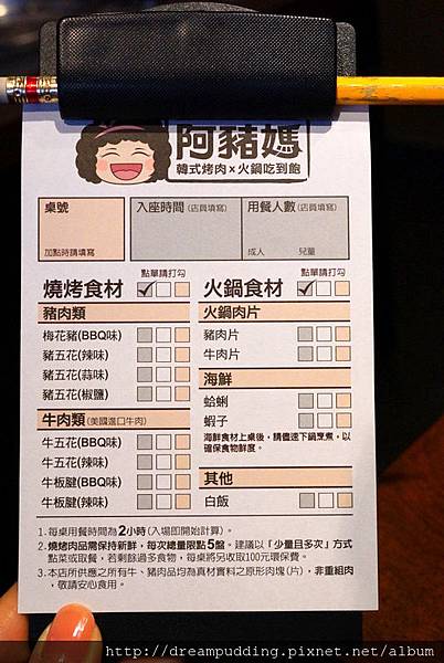點菜單上面的品項口味都寫的十分清楚,肉品跟海鮮還有白飯是劃單給服務人員後,由服務人員送來。肉品有分燒烤跟火鍋兩種,燒烤種類依豬肉跟牛肉有口味跟部位之分。