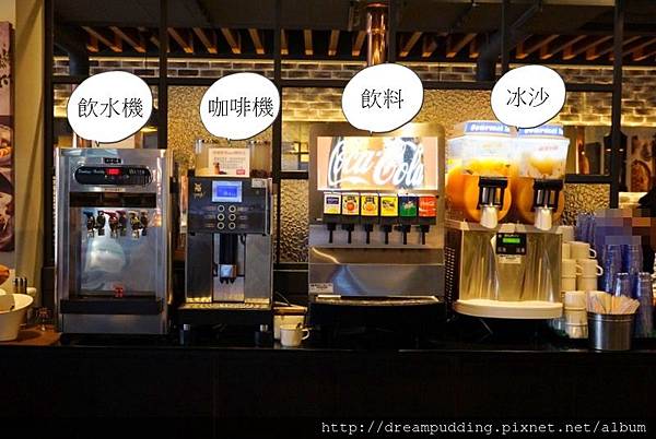 無限暢飲的飲料也蠻多選擇,除了基本配備的氣泡飲料之外,還有冰沙,貼心的是還有咖啡機跟飲水機。