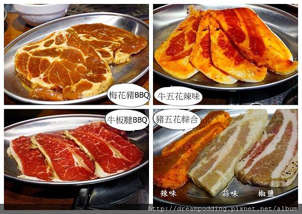 豬肉有梅花豬跟豬五花,口味有BBQ、辣味、蒜味跟椒鹽;牛肉有牛五花跟牛板鍵的BBQ跟辣味可以選擇,就看你比較喜歡哪個部位及口味。