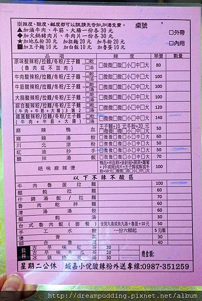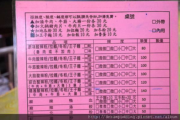 主打重慶酸辣粉,重慶酸辣粉主體是紅薯,也可以換成冬粉或王子麵或拉麵,湯、乾及辣度都可以自選,也有不辣專區。