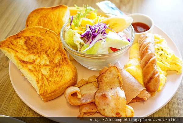內容物有生菜沙拉、培根火腿、德式香腸、英式吐司、炒蛋跟脆薯。
