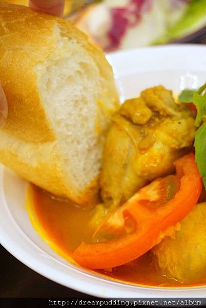 咖哩濃郁不會太過厚重,雞肉很嫩,手工法國麵包香酥蓬鬆,吸附醬汁吃起來帶點微辣。