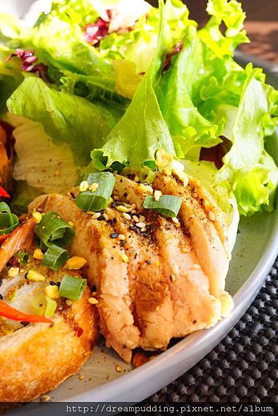 低溫烹調的雞肉也是舒肥軟嫩,份量有足;很喜歡他的生菜,口感新鮮嫩軟,搭配的醬汁檸檬油酸的很潤澤,好吃。