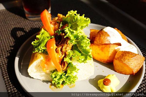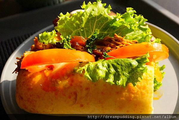 軟法蓬鬆,看似單調,但吃起來挺飽的,手撕的豬肉嚐起來軟嫩不鹹膩。