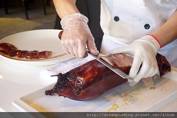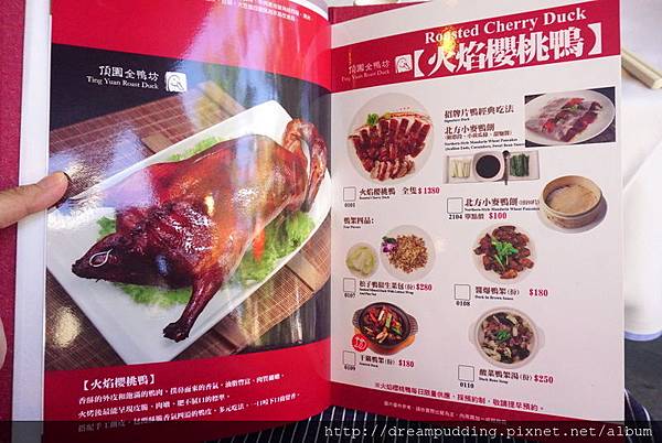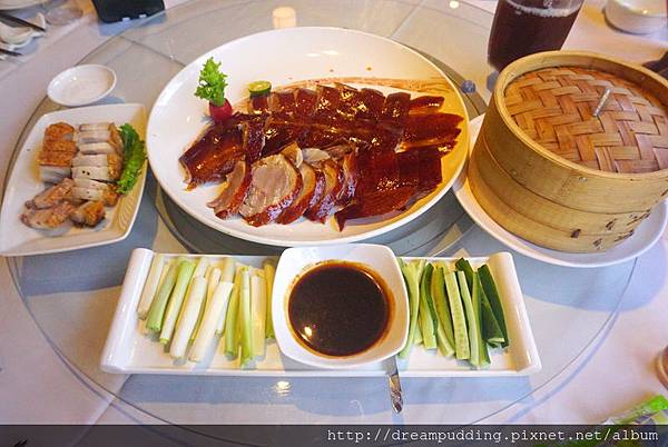 預訂了一隻火焰櫻桃鴨,附小麥餅皮跟蔥段、黃瓜及甜麵醬。