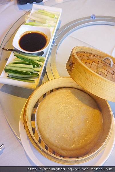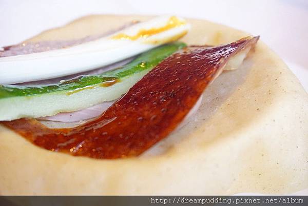 配上新鮮蔥段及黃瓜還有甜麵醬,用餅皮包著,很是美味。