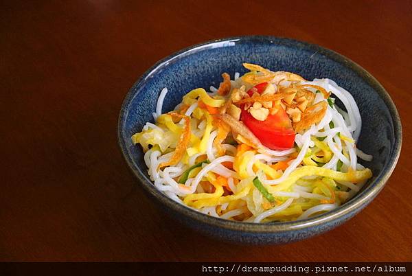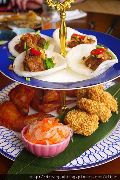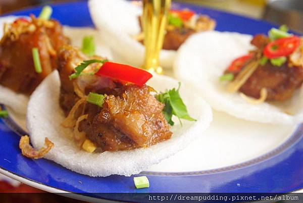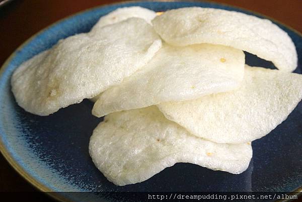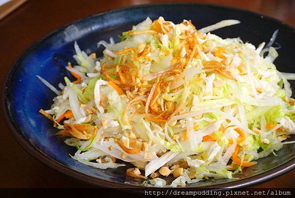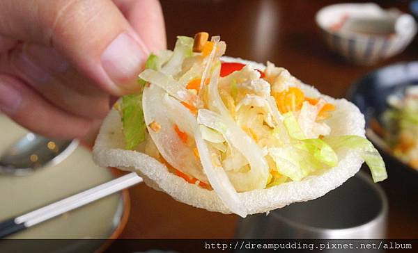青木瓜絲新鮮清脆,搭配雞絲跟花生碎還有酸甘的醬汁,放在輕盈的蝦餅上,嚐起來口感很有,而且很清爽。