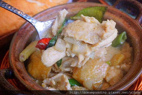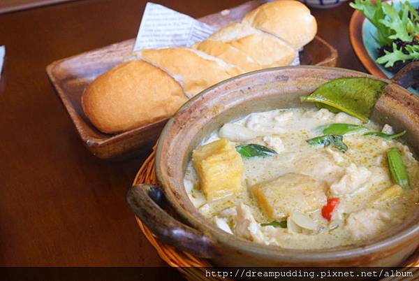 除了很嫩的雞肉之外,還有地瓜,搭配法國麵包吃,吸飽那濃郁微辣的湯汁,很是美味。
