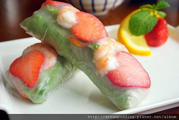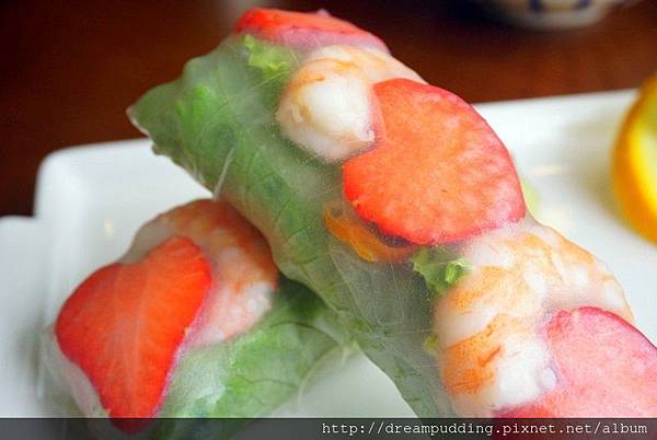 皮很薄,料很滿,看起來很美,但草莓的味道蓋過了鮮蝦,喜歡吃草莓的人應該會很愛。