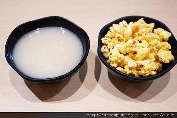 內用有玉米濃湯跟爆米花吃到飽;玉米濃湯潤澤,爆米花鹹甜帶酥脆的挺不錯吃。