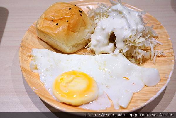點排餐附的餐包、太陽蛋跟生菜絲;餐包鬆軟還有奶油餡,挺不錯吃。