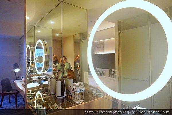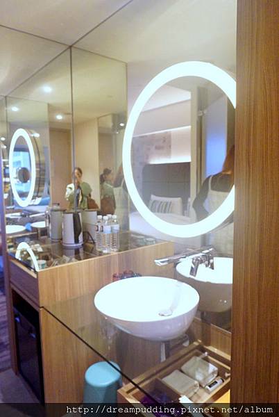 房間挺大的,明亮度也夠,一進門右手邊就是洗手台,鏡子有圈圈發亮燈環。