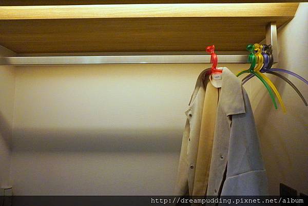 入口處門邊就是掛衣間,衣架是不會有吊掛痕跡的圓滑衣架。