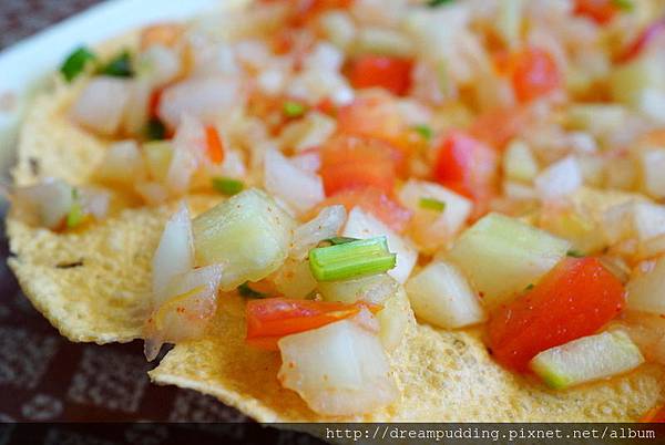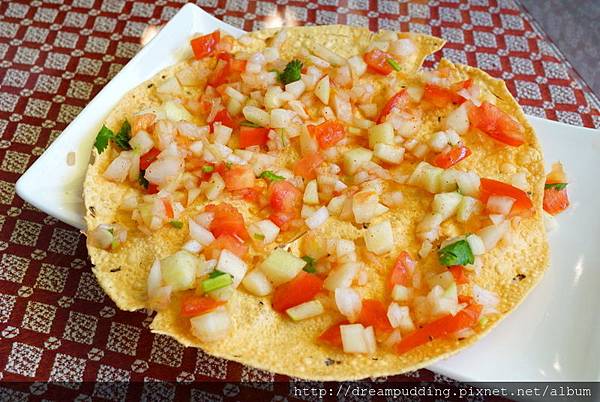 薄餅十分薄脆,上面的蔬菜丁新鮮帶點微辣,很有莎莎醬的口感,非常清爽,上桌得趕緊吃,薄餅才不會被蔬菜丁給浸溼減緩薄脆度。