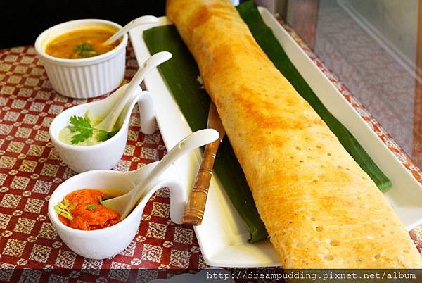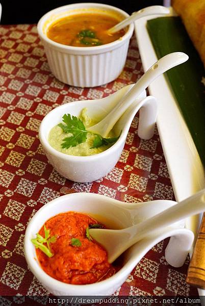 搭配了3種醬料,有潤澤的黃扁豆咖哩醬、清新的椰子醬以及辣椒醬。