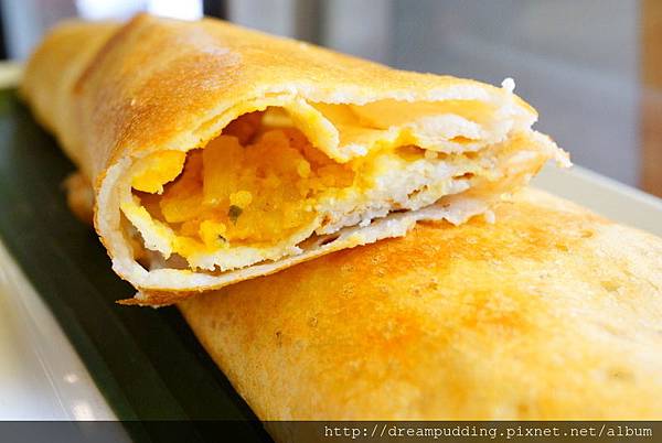 餅皮薄潤清爽,內餡像是有馬鈴薯泥,嘗起來有點像豆沙,清爽好吃,搭配醬料會有不同風味,我跟友人都很喜歡。